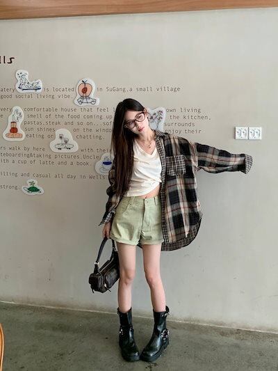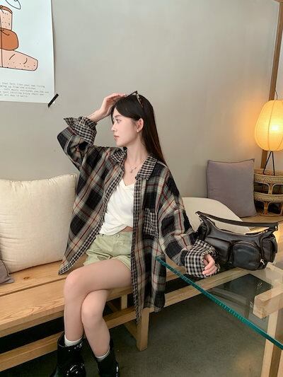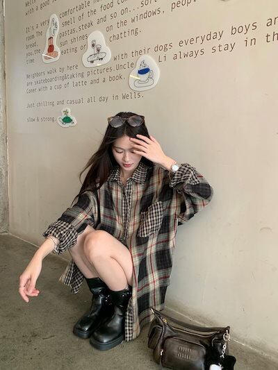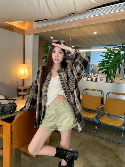 2024夏トップス シャツ 長袖 ボタン 襟 チェック柄 大きめサイズ 丈長め ゆったり 細見え 夏 茶色 ブラウン おしゃれ かわいい 韓国ファッション レディース お出かけ