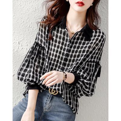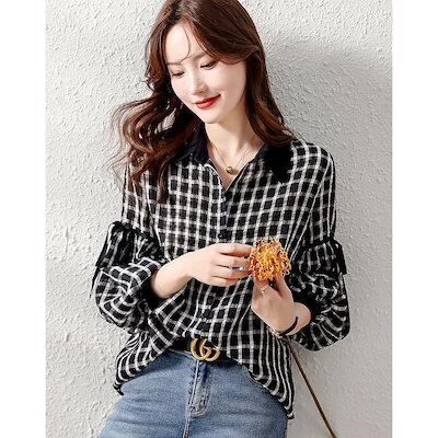 【人気商品】シフォンブラウス 春 シアーシャツ 秋 長袖ブラウス レディース チェック花柄 シャツ トップス 韓国 薄 シフォンブラウス ランタン袖 通勤 百掛け 長袖 tシャツ