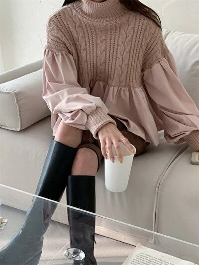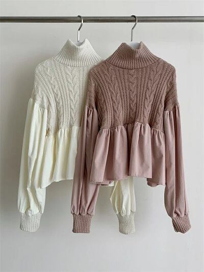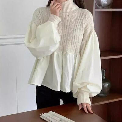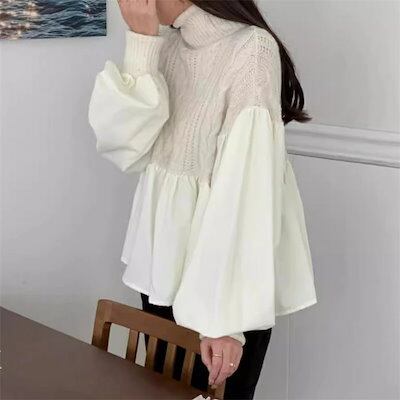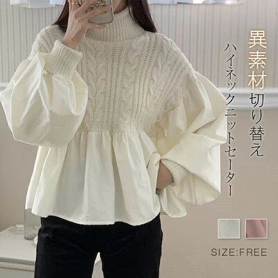 異素材切り替えニットセーター レディース 長袖 秋冬 ハイネック 異素材ドッキング ボリューム袖 ニット トップス ケーブル編み セーター プルオーバー 長袖 体型カバー 着映え トレンド カジュアル