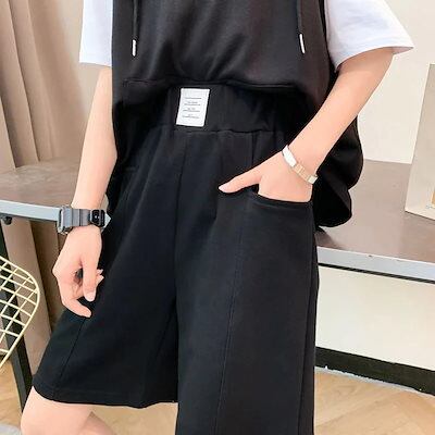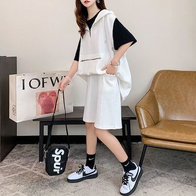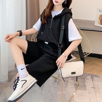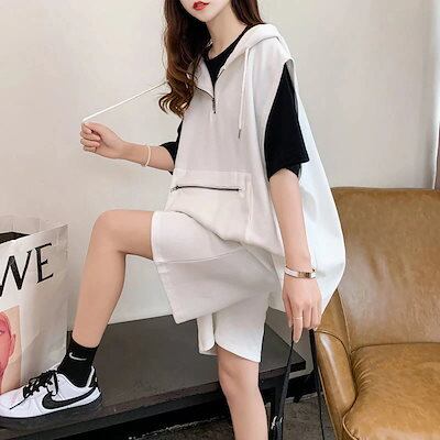 L-5XL 2点セット スポーツウェア レディース 夏服 フード付きノースリーブベスト+ショートパンツ おしゃれスウェット おしゃれヨガウェア