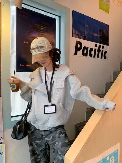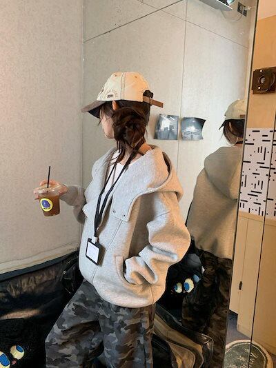 2024秋冬トップスかわいい パーカー フード付き韓国風長袖ゆったり白黒おしゃれレトロチャックシルエット韓国フルサイズファッション系ルーズレディースサイド学生通学トラック羽織り