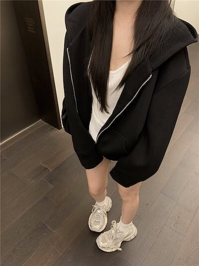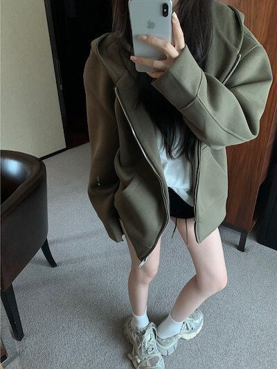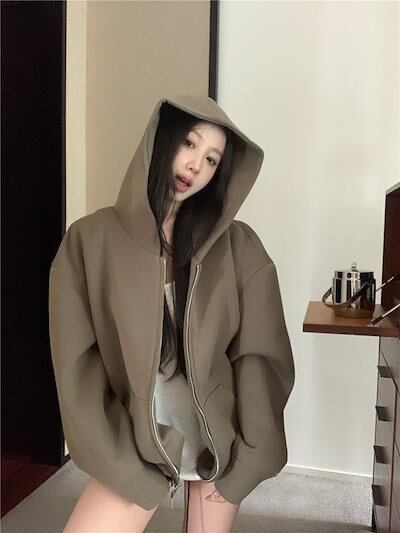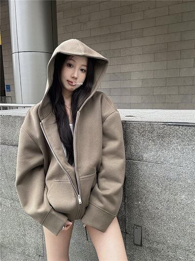 2024 秋冬トップスかわいいパーカーフード付き韓国風長袖ゆったり細見え黒おしゃれレトロチャッシルエット甘め大人っぽ韓国ダブルサイズファッション系ルーズレディースサイド袖お出かけ学生通学トラック羽織り