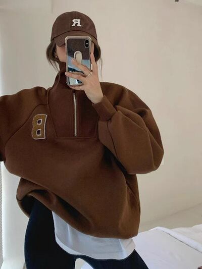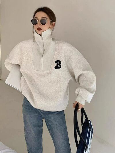 2024 秋冬 2TYPE 裹起毛トップス長袖かわいいプリントK-POPTロングレディース韓国風衣装カラールーズゆったりカジュアルハーフおしゃれサイズスリーブシルエットファッション系サイドシャツグレー