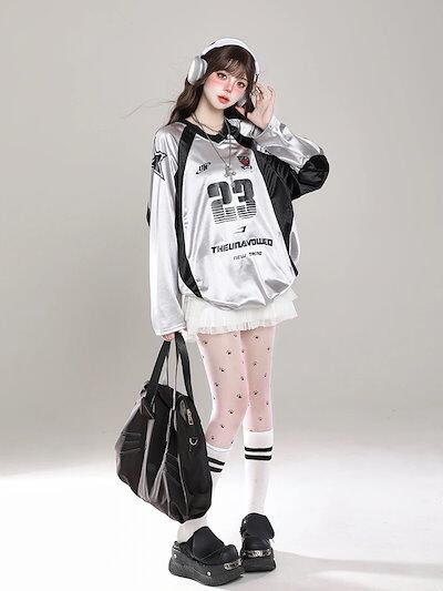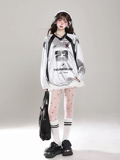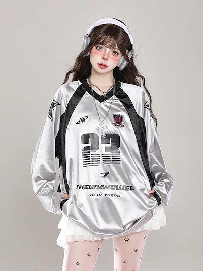 2024 秋冬 トレンドトップスバイカラー23長袖 かわいいTシャツレディース韓国風ロゴ衣装ルーズゆったりカジュアルおしゃれサイズスリーブVネックシルエットファッション系ロングサイドシャツK-POP春