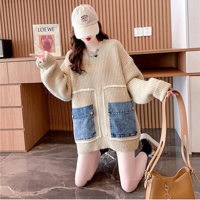 ニットセーター レディース 丸襟 秋冬 ポケット付き デニムポケット プルオーバー 長袖 切り替え セーター ロングセーター アウター ニット インナーセーター 無地 シンプル カジュアル おしゃれ