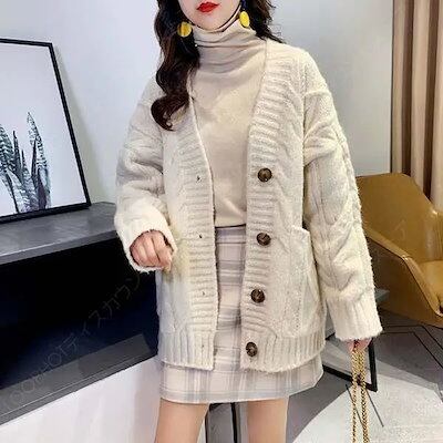 カーディガン 秋冬 厚手 赤 ざっくり ニット ケーブル編み セーター ローズ レディース ゆったり きれいめ 暖かい ニット 前開き ボタン付き アウター 長袖 おし-75