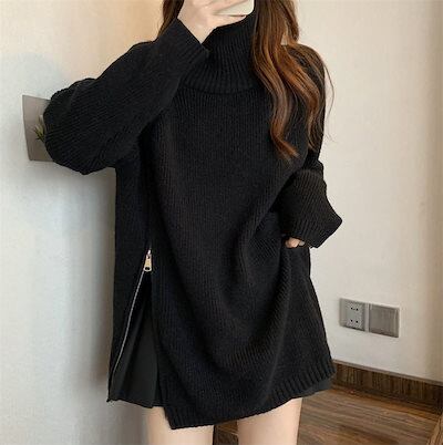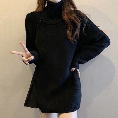 チュニック ニット レディース 長袖 セーター プルオーバー ニットセーター アウター ハイネック チュニックニット 無地 ファスナー 大きいサイズ ゆったり 体型カバー ニットソー 防寒 カットソー