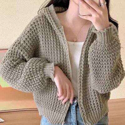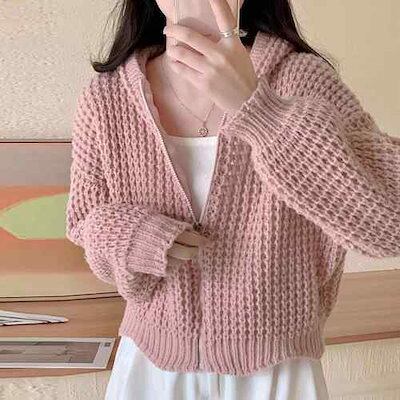 レディース おしゃれ フード付き ジップアップ ニットトップス 無地 ざっくりニット アウター
