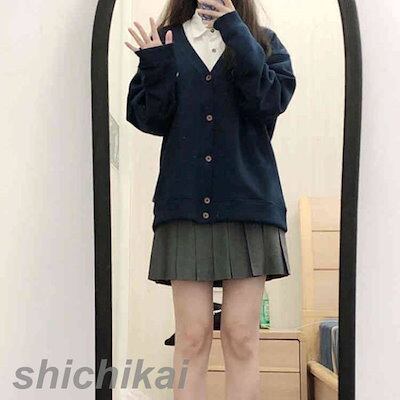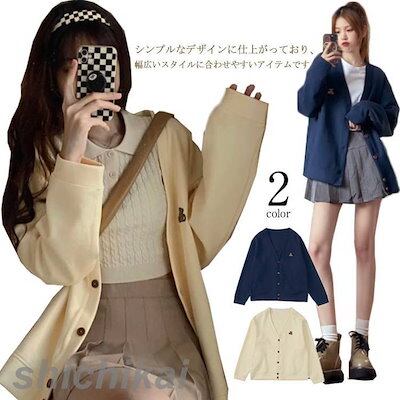 スクールカーディガン スウェットカーディガン Vネック 羽織り 薄手 レディース 女子 ネイビー 紺 ボタン アウター 秋 冬 春 パフスリーブ 学生服 高校生 無地 ビッグシルエット かわいい