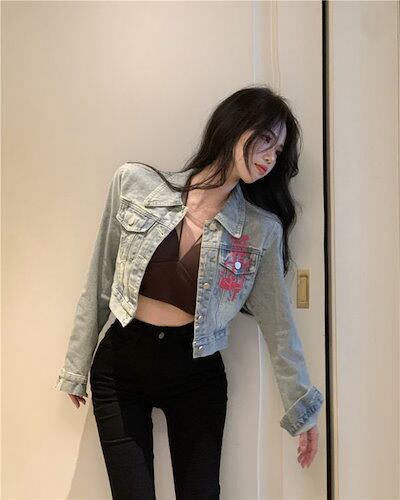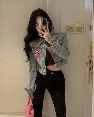 ペイントデザイン ショート デニムジャケット 落書き風 デニム カジュアル ハート 羽織り アウター 秋冬 おすすめ レディース オシャレ トレンド 人気 プチプラ 韓国ファッション