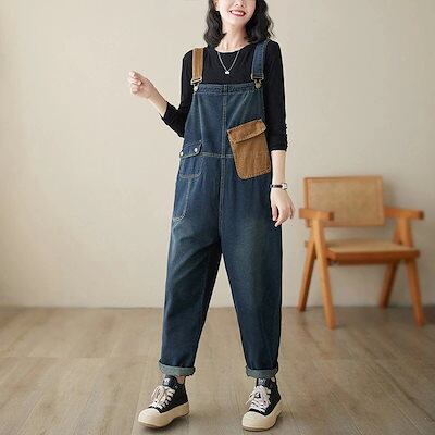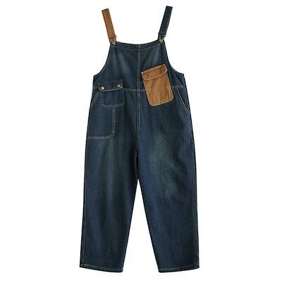デニムサロペット 韓国ファッション コントラストカラー 2024 春秋 新作 ゆったり 9分丈パンツ ワイドパンツ レディース オールインワンパンツ