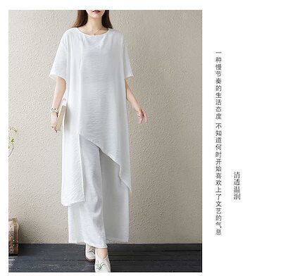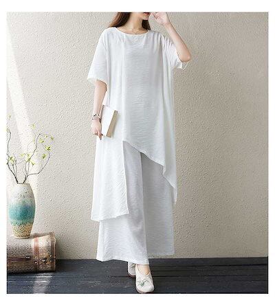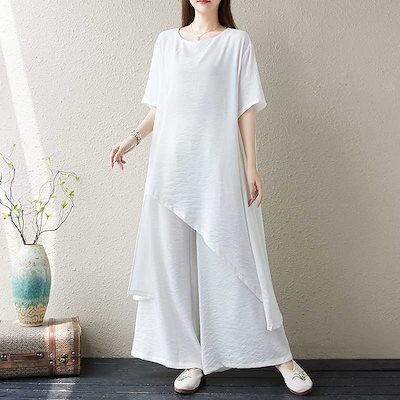「ファットガール」 2024夏新品 上下セット 綿麻 ブラウス+ワイドパンツ リネン 大きいサイズ 体型カバー レディース ホワイト セットアップ ヨガウエア ピラティス メガ割