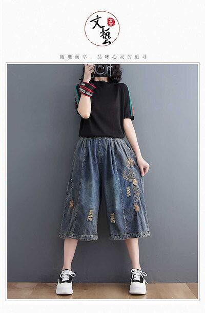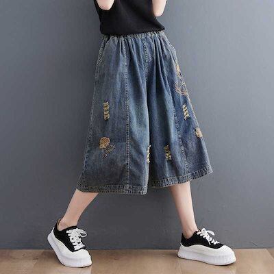 「ファットガール」 2024夏新品 七分丈 ワイドパンツ デニムパンツ ゴム 刺繍 大きいサイズ 体型カバー レディース パンツ メガ割