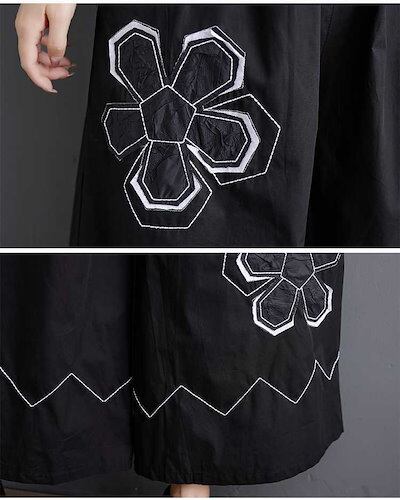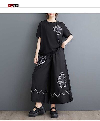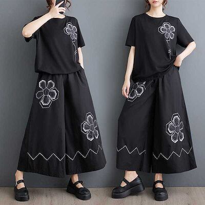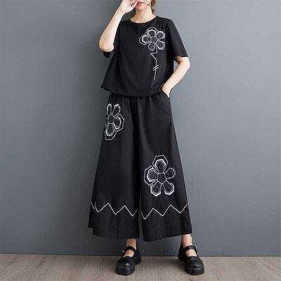 「ファットガール」 2024夏新品 上下2セット 花柄刺繍 Tシャツ+ワイドパンツ レトロ 巾着 大きいサイズ 体型カバー レディース セットアップ メガ割