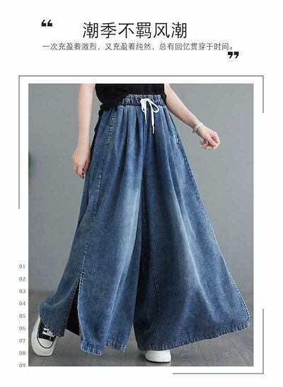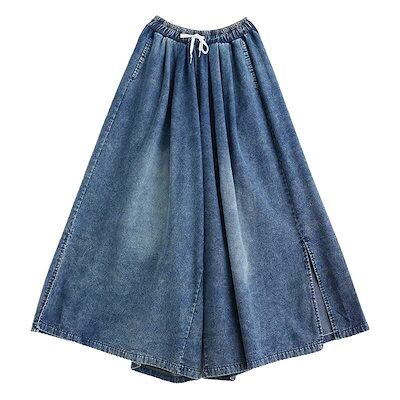 「ファットガール」 デニム ワイドパンツ キュロットスカート スリット ゴム ハイウエスト 体型カバー 大きいサイズ ゆったり レディース