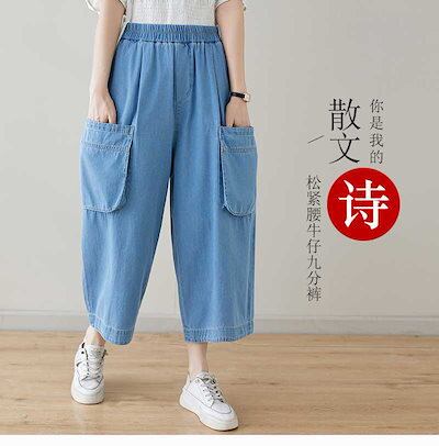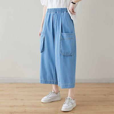 「ファットガール」 九分丈 デニムパンツ ワイドパンツ ジーンズ ポケット付き 夏 ゴム 体型カバー 大きいサイズ ゆったり レディース
