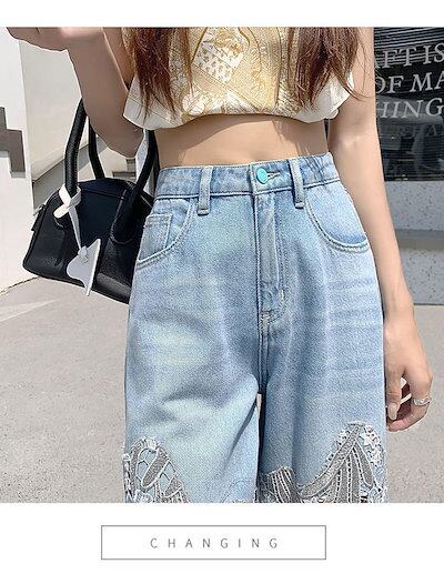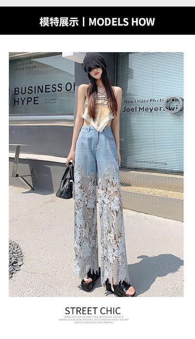 韓国 美脚 ファッション ボトムス ワイドパンツ デニムパンツ 夏 ロングパンツ レース 切り替え パンツ ゆったり ストレート ジーンズ ズボン