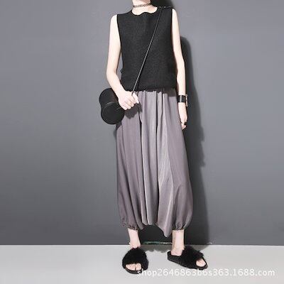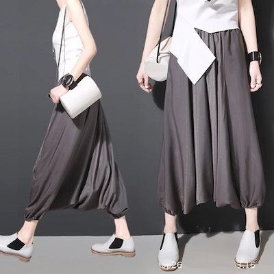 【J.Fashion】 シルクタッチ 夏 九分丈 キュロットスカート ワイドパンツ ハイウエスト ゴム サルエルパンツ レディース 薄手 スラックス メガ割