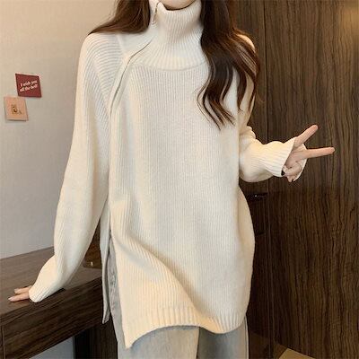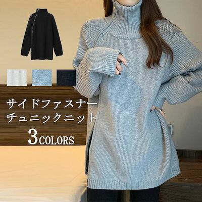 チュニック ニット レディース 長袖 セーター プルオーバー ニットセーター アウター ハイネック チュニックニット 無地 ファスナー 大きいサイズ 体型カバー ニットソー 防寒 カットソー