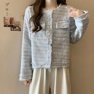 ジャケット ノーカラー ツイード金ボタン 羽織り オフィス ライトアウター きれいめ 長袖 秋冬 おすすめ レディース オシャレ トレンド 人気 プチプラ 韓国ファッション