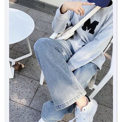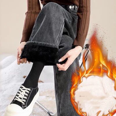 裏起毛ルーズ ウォッシュ加工 デニムレディース 秋冬 ハイウエスト ゆったり快適ストレートパンツ
