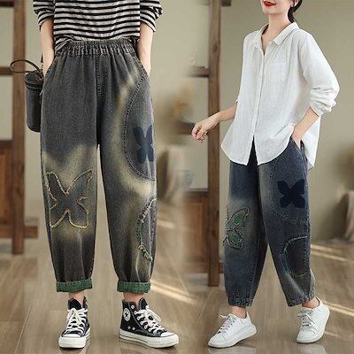 「ファットガール」 2024秋新品 デニムパンツ ロングワンピース 九分丈 蝶柄 ゴム 大きいサイズ 体型カバー レディース メガ割30%までに制限