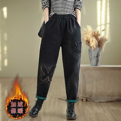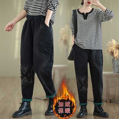 「ファットガール」 2024冬新品 裏起毛 デニムパンツ テーパードパンツ 蝶柄刺繍 大きいサイズ 体型カバー 厚手 保温 レディース ロングパンツ ジーンズ メガ割30%制限