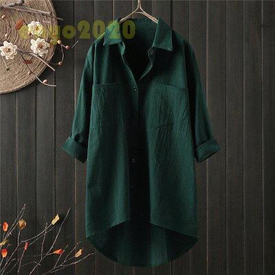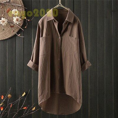 ロングシャツ ブラウス シャツ トップス シャツブラウス レディース チュニック ロング 折り襟 綿麻 長袖 無地 ポケット 体型カバー ゆったり シンプル 30代