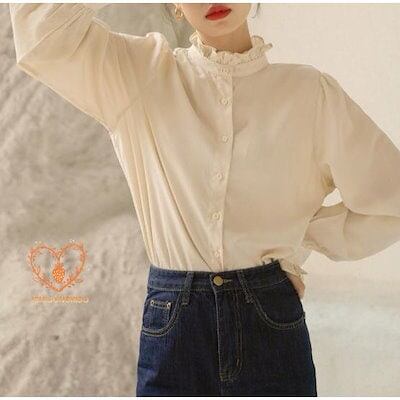 レディース トップス シャツ ブラウス フリルブラウス ハイネック 立ち襟 スタンドカラー 体型カバー ボリューム袖 バルーンスリーブ 白