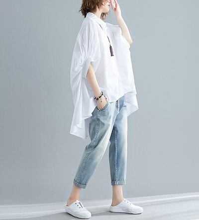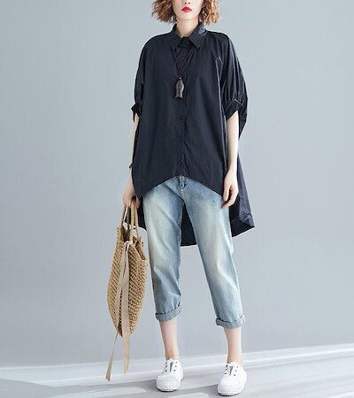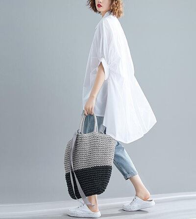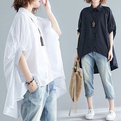 ドルマン フィッシュテール 前後差 シャツ ブラウス トップス レディース 5分袖 半袖 春夏 大きめ 大きいサイズ 立ち襟 体型カバ ゆったり 涼しい バルーンスリーブ カジュアル ホワイトブラック