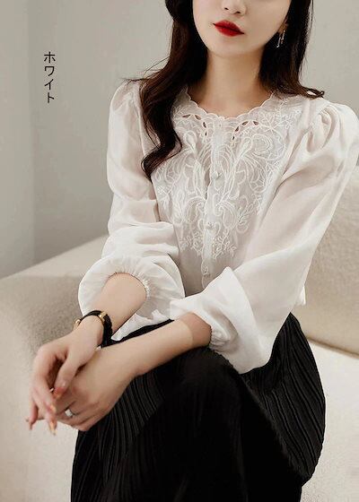 刺繍ブラウス長袖レディースシャツトップスフリル襟シャツブラウスノーカラーバルーンスリーブゆったり前開きボタンおしゃれ薄長袖tシャツ羽織り羽織る春夏304050通勤フォーマルオフィス仕事黒白紫