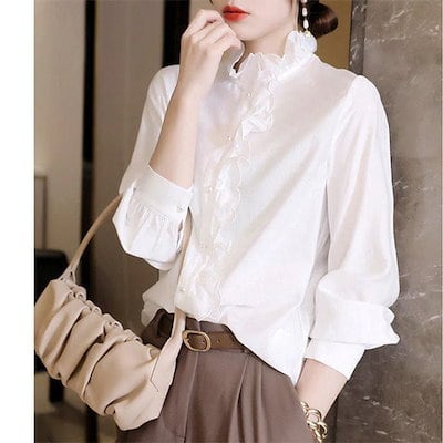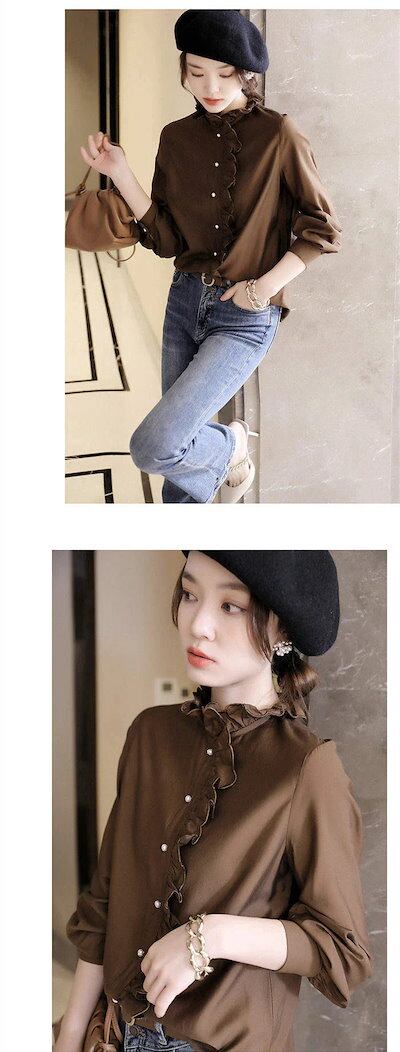 シャツブラウスレディースシャツブラウス長袖フリルシャツシンプル立ち襟ボタン留め大きいサイズ長袖シャツ通勤OLおしゃれ大人かわいい通学ビジネス秋前開き可愛い203040