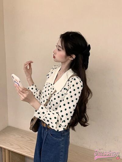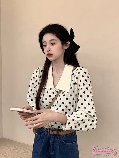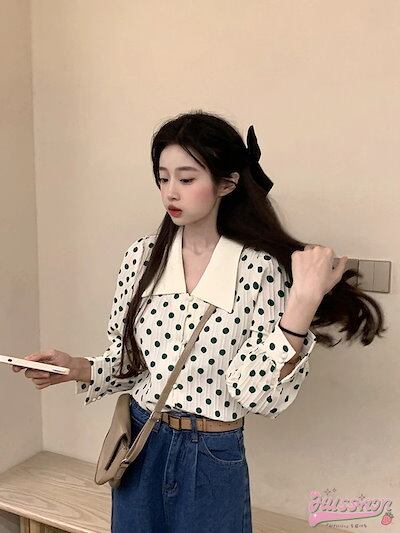 白 長袖 お出かけ 2024 シャツ かわいい ボタン ドット柄 春夏トップス ガーリー おしゃれ 韓国ファッション 襟 甘め レディース ホワイト Vネック キュート バブル袖 春