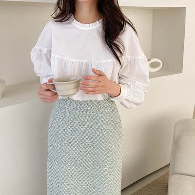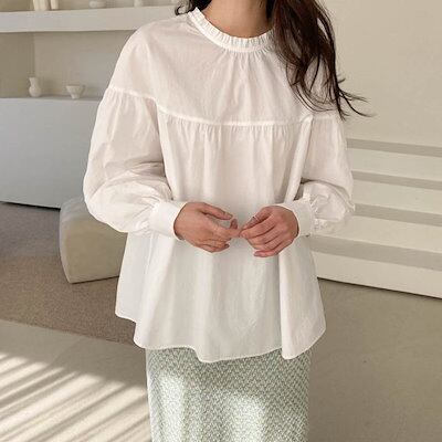 ブラウス レディース 前後2way シャツ 長袖 シャツブラウス パフスリーブ 襟フリル トップス 無地 クルーネック 大人 かわいい おしゃれ エレガント フェミニン フォーマル オフィス シンプル