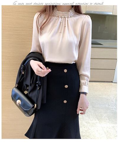 パール付き ブラウス 立ち襟ブラウス レディース シフォン プルオーバー ブラウス フロントタック 通勤 トップス 長袖 オフィス 仕事 事務所 ベーシック スーツインナー フェミニン エレガント 春