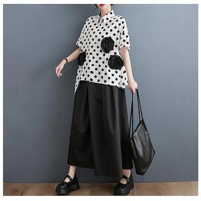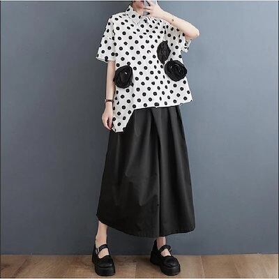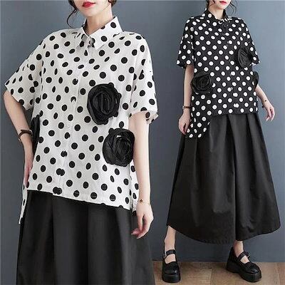 2024新作 春夏 シャツ レディース 半袖 折り襟 前開き 花飾り 立体感あり 大人可愛い ドット柄 自然に体型カバー 裾 不規則 トレンド感ある仕上がり
