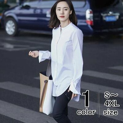 2024新作 tシャツ Tシャツ シャツ ブラウス レディース チュニックシャツ ロングシャツ ノーカラー 無地 長袖 ホワイト 白 ロング丈 襟なし 春夏