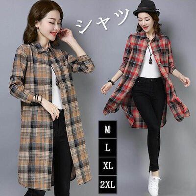 2024新作 ブラウス トップス シャツ シャツブラウス レディース ロング丈 長袖 チェック柄 綿麻 体型カバー ゆったり 前開き 折り襟 オシャレ カジュアル風