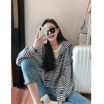秋新作 パーカー ジャケット レディース ボーダー柄長袖 ジップアップ パーカー チュニック ゆったり 体型カバー カジュアル アウター