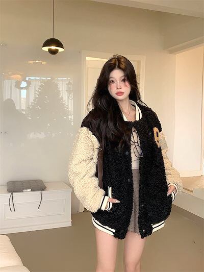 秋冬防寒あったかアウター中綿刺繍配色韓国風ロゴ コートかわいいブルゾンファー付きファッション系裹起毛大人ゆったりカジュアルストリートサイズレディースムートンエコゆるダボシルエット学生通学丈スポーティー