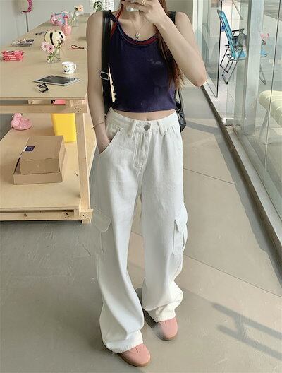 2024 春夏パンツ デニム ジーンズ ワイド ストレート ハイウエスト 脚長効果 美脚効果 細見え ポケット付き 春 白 カジュアル 韓国ファッション レディース お出かけ
