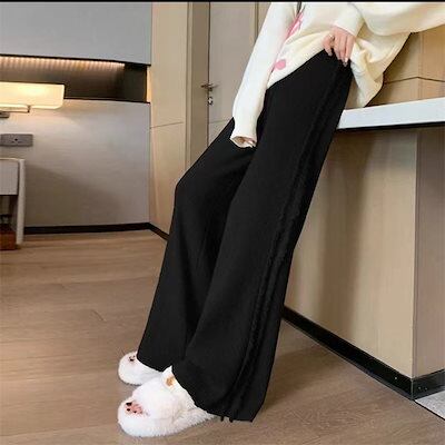 スラックス スラックスパンツ ワイドパンツ サイドフリンジ ニットパンツ ワイド ハイウエスト ストレート ボトムス フリンジ ニット パンツ レディース リブパンツ ゆったり ロング 暖か 柔らかい