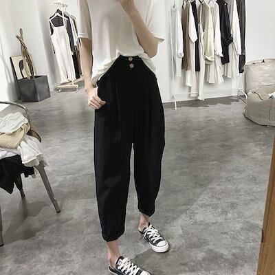 テーパードパンツ ボタンカジュアルパンツレディース新作ハイウエストルーズ韓国ゴムハーレムパンツパンツ
