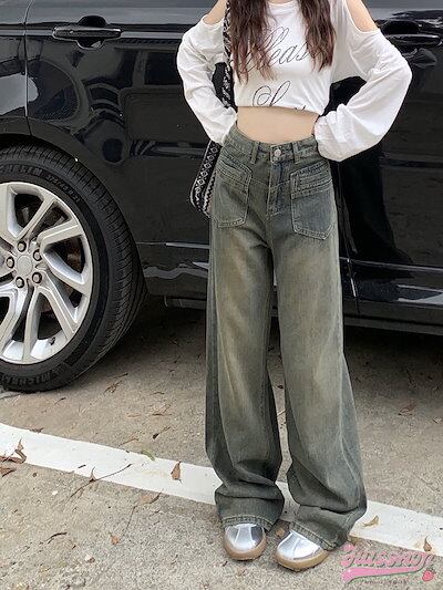 2024 春夏レトロジーンズ女性春新作ハイウエスト薄型デザインワイドパンツストレートドラッグズボン潮