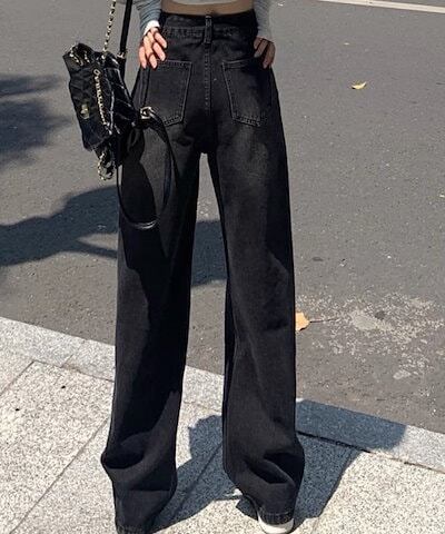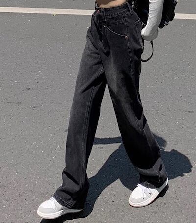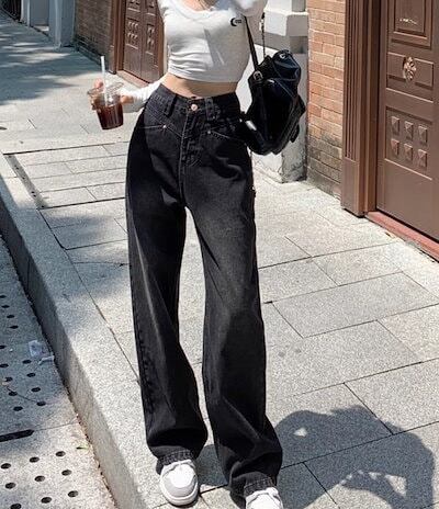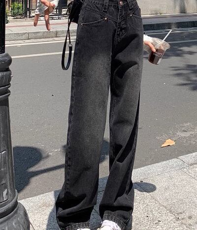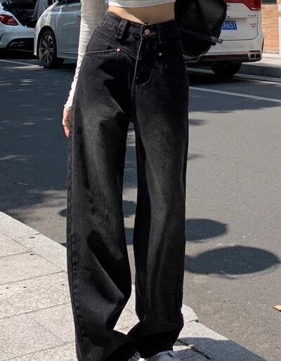 2024春夏 アメリカン パンツ デニム ブラック ジーンズ ロング丈 スキニー レッグ加工 ハイウエスト 脚長効果 美脚効果 細見え 秋 カジュアル 韓国ファッション お出かけ1