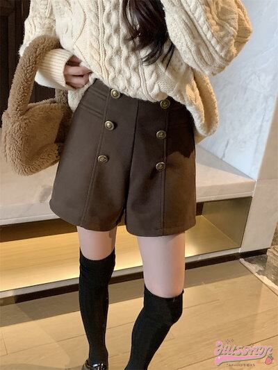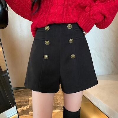2024春夏パンツ ショート丈 ツイード ダブルボタン ハイウエスト 脚長効果 美脚効果 細見え 秋冬 黒 茶色 カジュアル 韓国ファッション レディース お出かけ