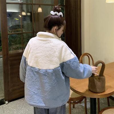 ボア ジャケット レディース 韓国 ファッション バイカラー ジップアップ ベアジャケット ワンポイント ロゴマーク スマイル ボア フリース ブルゾン