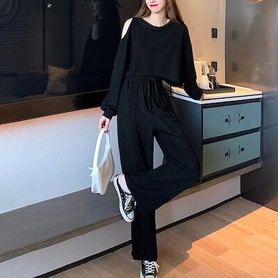 春秋 新作 スウェット+ズボン 2点セット トップス ハイウエスト ワイドパンツ 薄手 セットアップ レディース