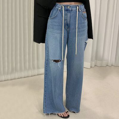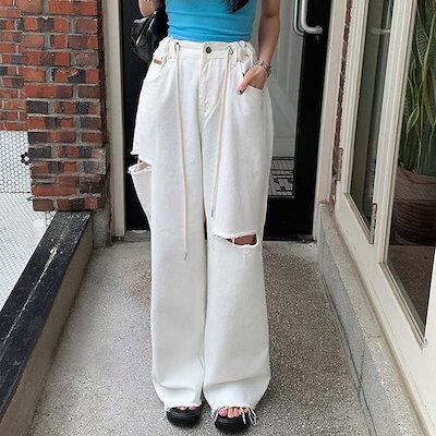 ワイドパンツ デニムパンツ レディース 春 夏 パンツ デニム ジーンズ ダメージ ジーンズ ジーパン ボトムス リラックスパンツ ゆったり 体型カバー大人 ウエストゴム 柔らか 着?せ 美脚 お