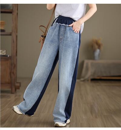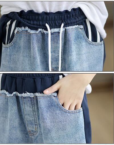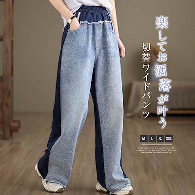 ワイドデニムパンツ 切替 ワイドパンツ レディース スウェット パンツ 春秋 ロングパンツ デニムパンツ ジーンズ ボトムス リラックス ウエストゴム ジーパン バギーパンツ イージーパンツ ゆった